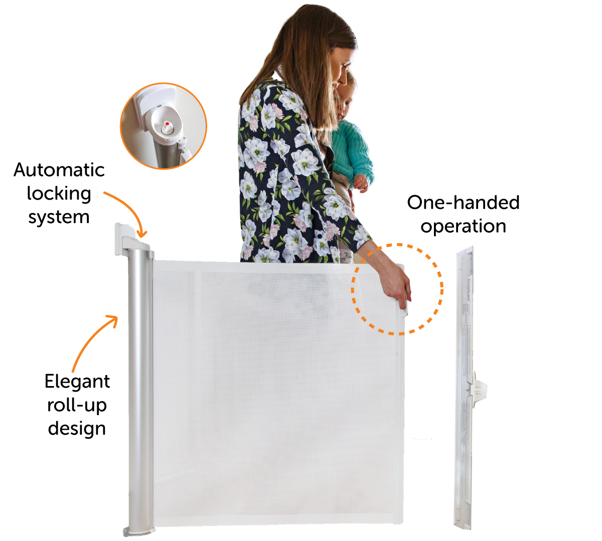Crafted to match modern home aesthetics, the KiddyGuard® Accent features sleek mesh material, available in white or black, that slides effortlessly into a brushed aluminum housing.